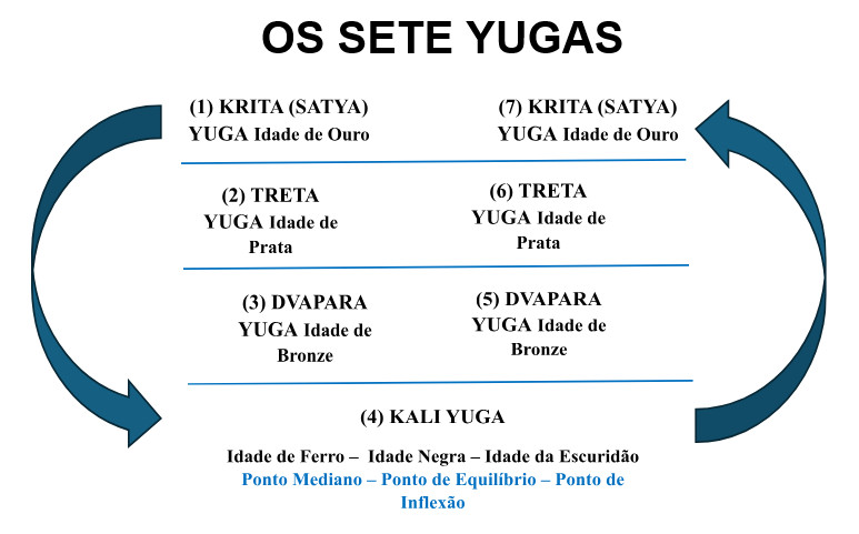 Isso fica claro o suficiente – há um Krita Yuga (sinônimo de Satya Yuga), um Treta Yuga, uma Dvapara Yuga, um Kali Yuga e, em seguida, outro Dvapara Yuga, outro Treta Yuga e outro Krita Yuga, que encerra o ciclo setenário. Isso foi ilustrado no diagrama no início deste artigo.